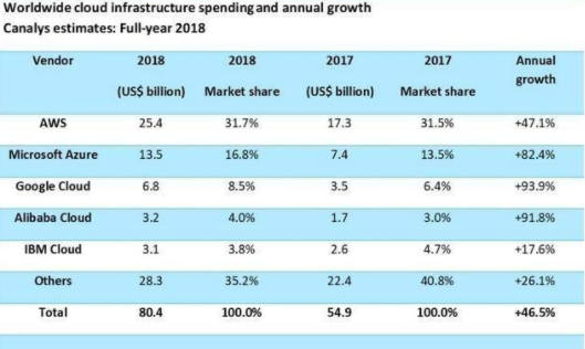 據(jù)數(shù)據(jù)顯示,AWS依然是全球云計算市場的領(lǐng)頭羊,其2018年云計算營收規(guī)模達(dá)到了254億美元,占有31.7%的市場份額。