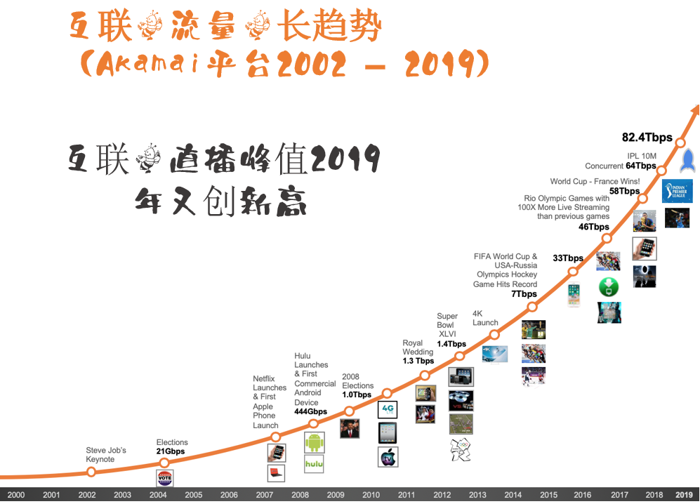 從2002年至今,Akamai平臺檢測到的流量增長主要源自于視頻相關(guān),特別是世界杯及奧運會等重大賽事活動帶來了直播流量峰值的大爆發(fā)。此外,流媒體也帶動了重要的流量增長?;ヂ?lián)網(wǎng)視頻發(fā)展的基礎(chǔ),便要求了其能兼容各種設(shè)備,可適應(yīng)任何的網(wǎng)絡(luò)環(huán)境。