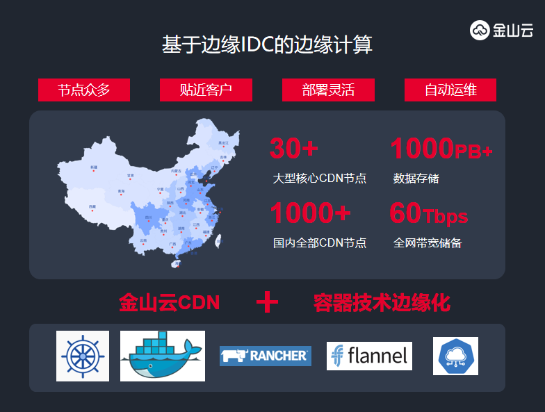 首先是基于IDC的邊緣計算,它是結(jié)合了金山云60T的帶寬,1000個節(jié)點規(guī)模的基礎網(wǎng)絡,以及邊緣云的技術(shù),通過這個系統(tǒng)可以允許客戶把自己的業(yè)務部署在邊緣節(jié)點上,把運維的事情交給金山云。
