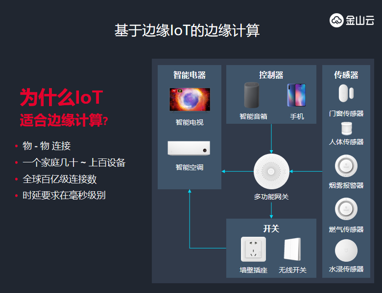 為什么IoT適合邊緣計算?下圖為金山云IoT解決方案簡單的縮影,其中家庭網(wǎng)關作為IoT的中心,輸入是感應器的信號,通過智能手機及小愛音箱,可以智能控制開關和智能電器設備。