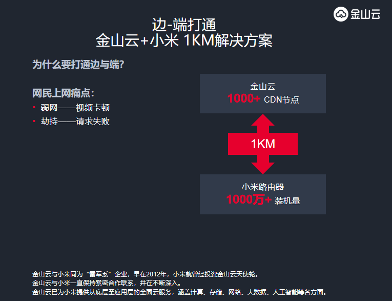 金山云除了在邊和端上布局邊緣計算方案外,還推出了打通邊與端的解決方案——1KM邊緣計算解決方案。根據(jù)小米路由器的統(tǒng)計,有2%左右的網(wǎng)民上網(wǎng)面臨著弱網(wǎng),視頻會卡頓,解析被劫持的時候造成請求失敗等的情況。據(jù)斯文介紹:“我們結(jié)合金山云一千個以上的CDN節(jié)點和小米一千萬以上的裝機量,小米路由器訪問金山云的時候都可以做到?jīng)]有弱網(wǎng),沒有劫持。”