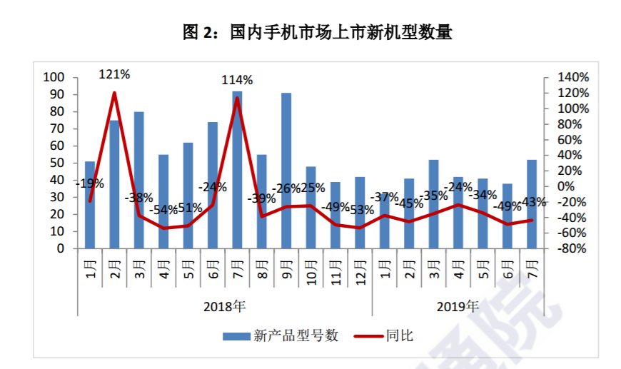 國(guó)內(nèi)手機(jī)市場(chǎng)上市新機(jī)型數(shù)量。2019 年 7 月,上市新機(jī)型 52 款,同比下降 43.5%,含 2G 手機(jī) 16 款、4G 手機(jī) 32 款、5G 手機(jī) 4 款;2019 年 1-7月,上市新機(jī)型 298 款,同比下降 39.1%,含 2G 手機(jī) 63 款、3G 手機(jī) 1 款,4G 手機(jī) 229 款、5G 手機(jī) 5 款。