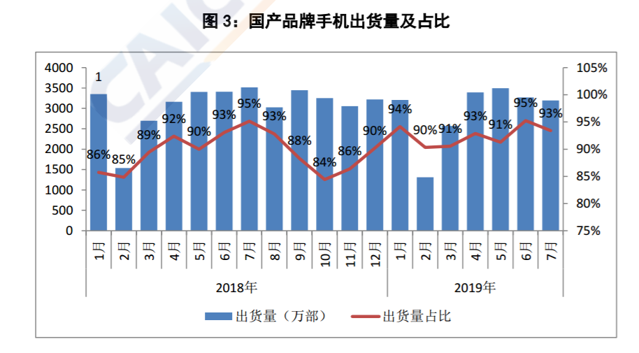 報(bào)告指出,2019 年 7 月,國(guó)內(nèi)手機(jī)市場(chǎng)總體出貨量 3419.9萬(wàn)部,同比下降 7.5%。 2019年 1-7 月,國(guó)內(nèi)手機(jī)市場(chǎng)總體出貨量 2.20 億部,同比下降 5.5%,其中 4G 手機(jī) 2.11 億部,同比下降 4.3%。