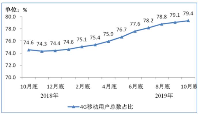 截至10月底,三家基礎(chǔ)電信企業(yè)的移動電話用戶總數(shù)達(dá)15.99億戶,同比增長2.9%,較上年末凈增3291萬戶。其中,4G用戶規(guī)模為12.69億戶,占移動電話用戶的79.4%。