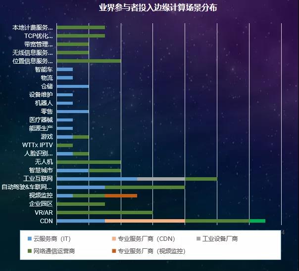邊緣計(jì)算領(lǐng)域目前有很多“玩家”參與,從不同的用戶切入、從應(yīng)用切入、從網(wǎng)切入都可以找到它的位置。在目前的參與者當(dāng)中,數(shù)量最多的就是CDN,包括專(zhuān)業(yè)的云CDN廠商和視頻云廠商,云服務(wù)商和運(yùn)營(yíng)商都有自己的CDN去做這部分投入,在整個(gè)應(yīng)用場(chǎng)景當(dāng)中是占比最高的。