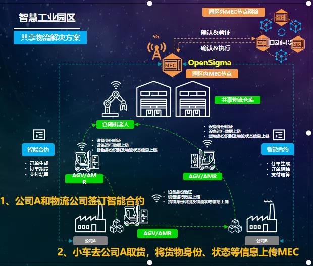 基于以上業(yè)務(wù)痛點(diǎn),中國(guó)移動(dòng)在智慧物流園區(qū)場(chǎng)景,基于移動(dòng)自研邊緣計(jì)算通用平臺(tái)OpenSigma,集成區(qū)塊鏈能力,保證數(shù)據(jù)安全性,同時(shí)提供自動(dòng)化管理。應(yīng)用5G+MEC,提供更高效的數(shù)據(jù)傳輸通道和應(yīng)用計(jì)算能力,有效降低邊緣控制和決策數(shù)據(jù)的處理時(shí)延,提高生產(chǎn)效率。通過(guò)鏈上智能合約對(duì)服務(wù)全生命周期進(jìn)行自動(dòng)化管理,保障物流數(shù)據(jù)的可追溯性及服務(wù)流程透明度。