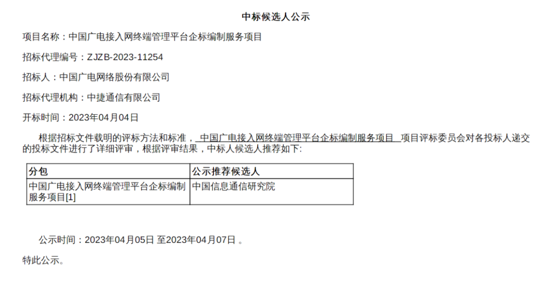 4月6日,中國(guó)廣電網(wǎng)絡(luò)股份有限公司公示了中國(guó)廣電接入網(wǎng)終端管理平臺(tái)企標(biāo)編制服務(wù)項(xiàng)目中選候選人情況。