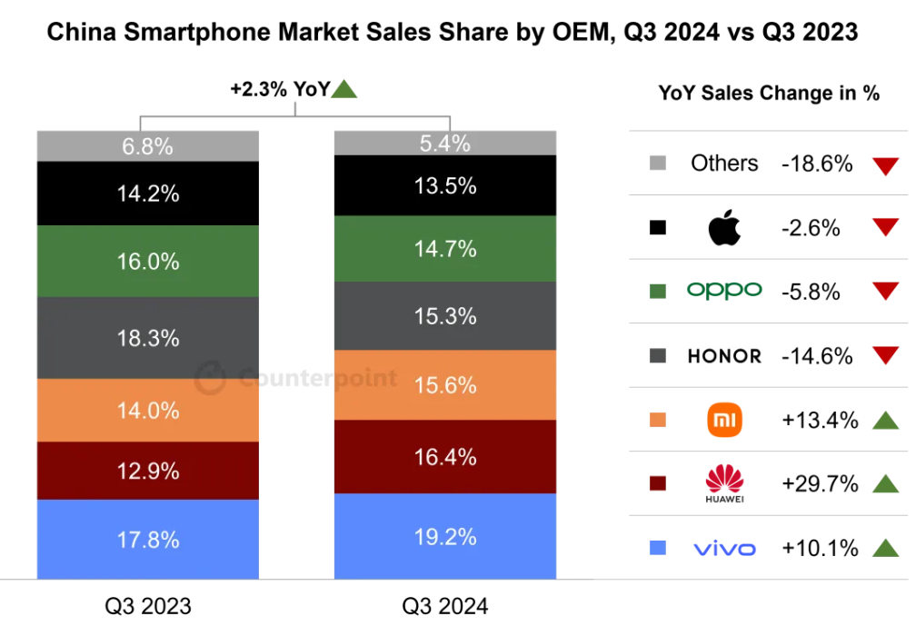 10月28日,調(diào)研機構(gòu)Counterpoint Research發(fā)布了2024年三季度中國智能手機銷量情況。