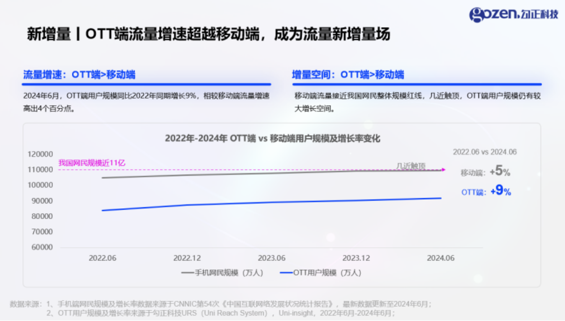 近幾年,智能大屏(OTT端)流量持續(xù)增長(zhǎng),用戶注意力大幅增加,成為各方瞄準(zhǔn)的新目標(biāo)。一方面,OTT端流量增速趕超移動(dòng)端。根據(jù)勾正URS數(shù)據(jù)顯示,2024年6月,OTT端用戶規(guī)模同比2022年同期增長(zhǎng)9%,相較移動(dòng)端高出4個(gè)百分點(diǎn)。另一方面,OTT端流量增長(zhǎng)空間高于移動(dòng)端。我國(guó)網(wǎng)民手機(jī)上網(wǎng)的使用率高達(dá)99.7%,接近天花板,而OTT端用戶規(guī)模仍有較大增長(zhǎng)空間。