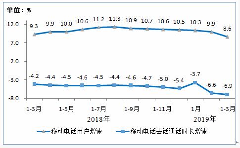 移動電話通話量持續(xù)下降。一季度,全國移動電話去話通話時長完成5850億分鐘,同比下降6.9%,降幅較上年末擴大1.5個百分點;全國固定電話主叫通話時長完成301億分鐘,同比下降18.8%。