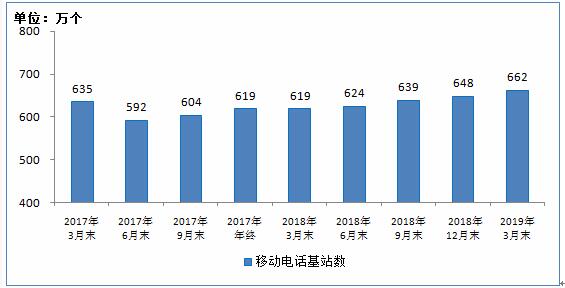 圖10 2017年3月末-2019年3月末移動電話基站數(shù)發(fā)展情況