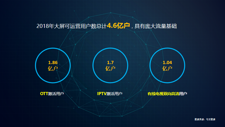 根據(jù)研究報告顯示,2018年大屏可運營用戶數(shù)總計4.6億戶,具有龐大的流量基礎(chǔ),OTT激活用戶1.86億,IPTV激活用戶1.7億,有線雙向電視1.04億,累計在一起,雙向互動可運營用戶達到4.6億。